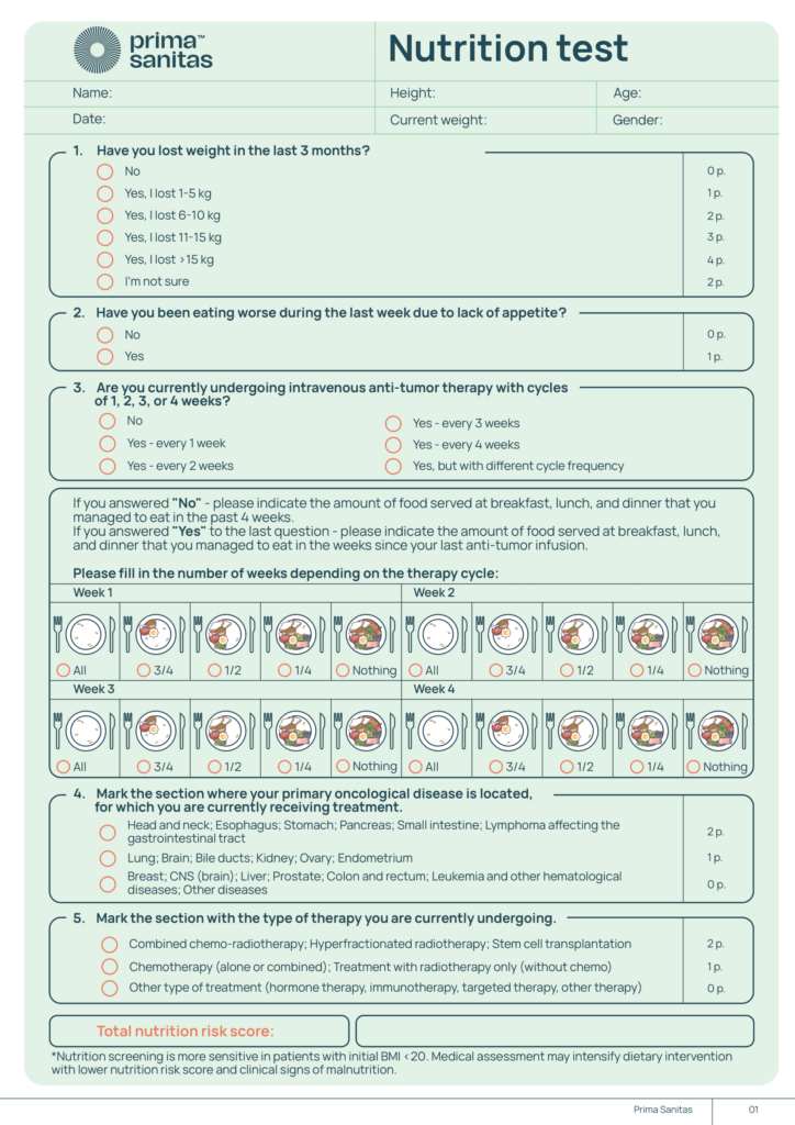 Prima Sanitas provides both patients and healthcare professionals with accessible information sources regarding nutrition, sleep, and physical activity during therapy. This includes an online generator for creating personalized diets, certified tools, and established methodologies for screening, prevention, diagnosis, and treatment of malnutrition according to the best scientific data and current recommendations from dietary societies.